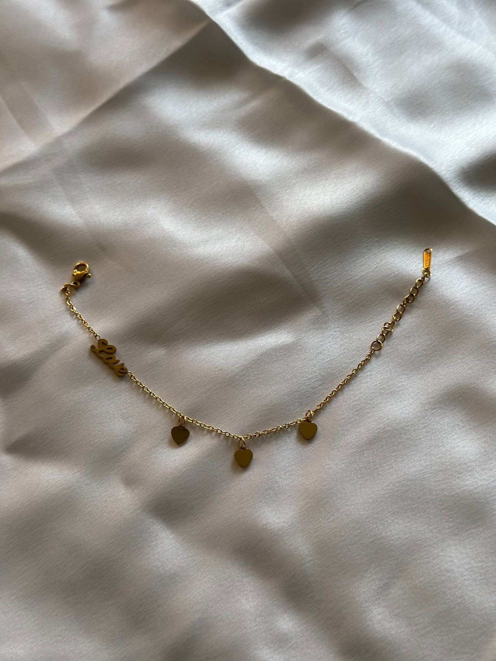 A simple gold chain for your wrist. It has the word “Love” and three small hearts hanging from it. This light chain is easy to wear every day and matches any outfit.