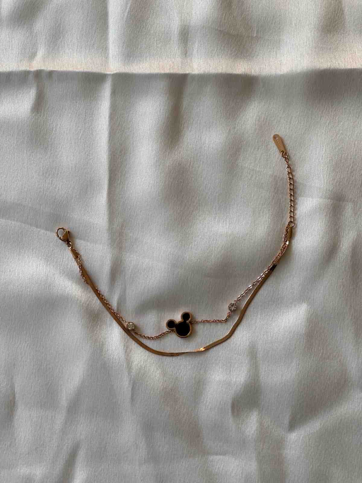 Rose gold two-strand bracelet with a black Mickey head charm.