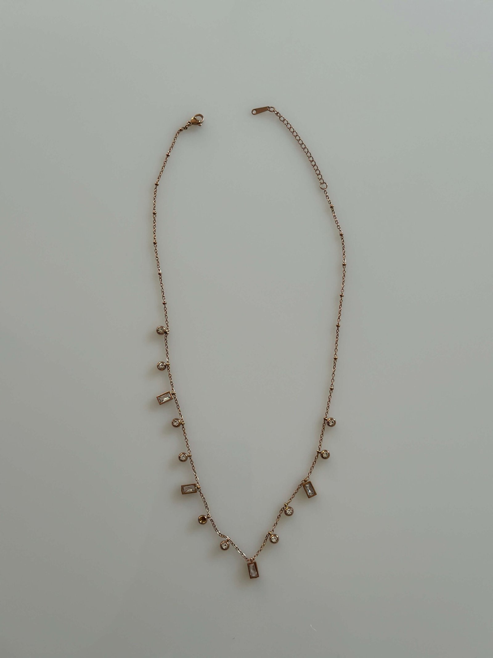 A stunning piece that captures light from every angle, this delicate necklace is set on a fine, beaded rose gold-tone chain. It features a dazzling cascade of alternating stones, combining brilliant-cut rounds with sophisticated baguette-cut clear gems.